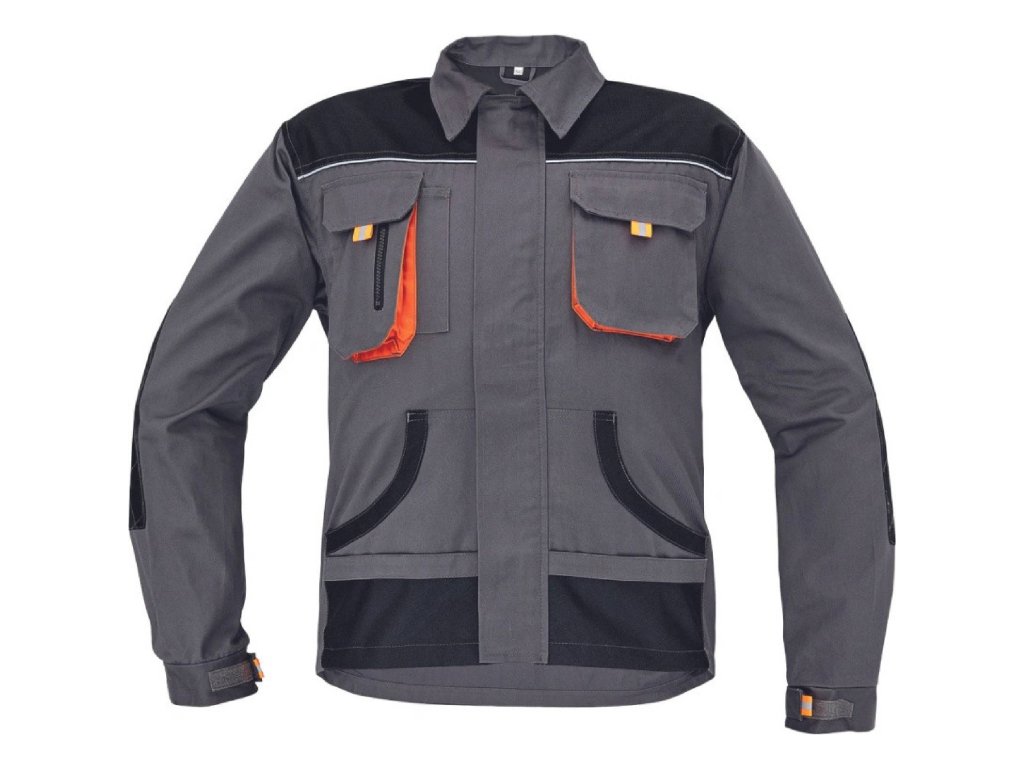 Pánska pracovná blúza, zapínanie na zips s príklopkou. 2 náprsné vrecká s príklopkou na suchý zips. 2 multifunkčné bočné vrecká v páse. Polyesterová výstuž Oxford na lakťoch a ramenách
