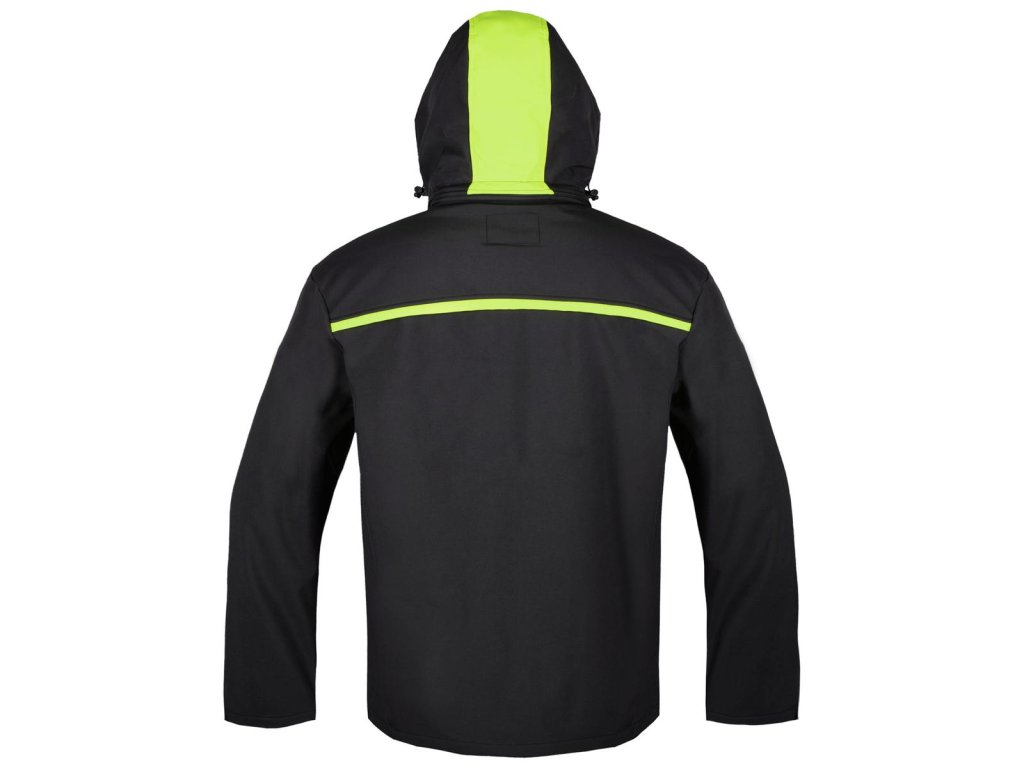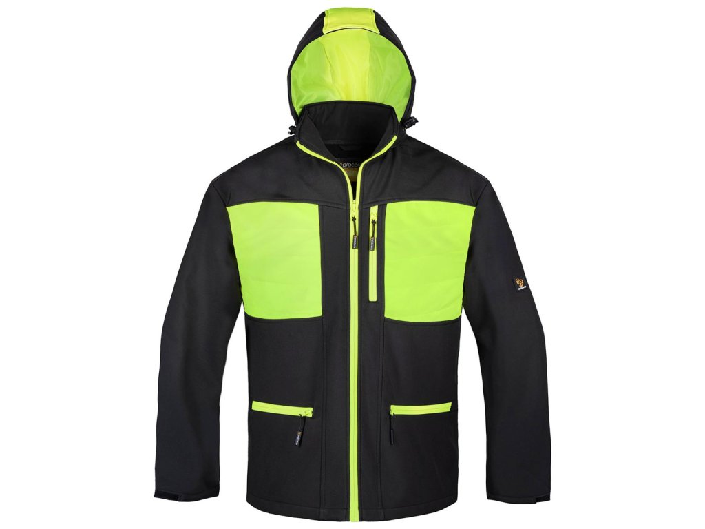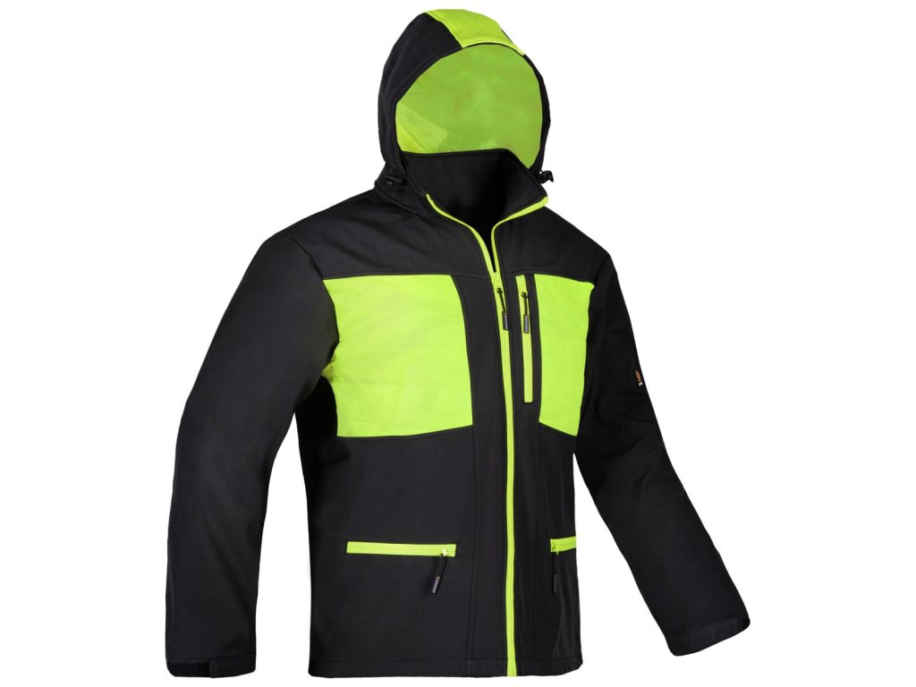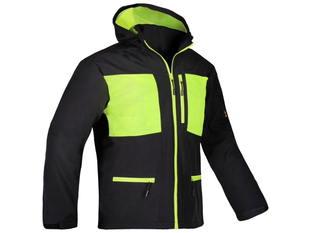 Softshellová bunda (100 % polyester) v čiernej farbe so žltými prvkami.