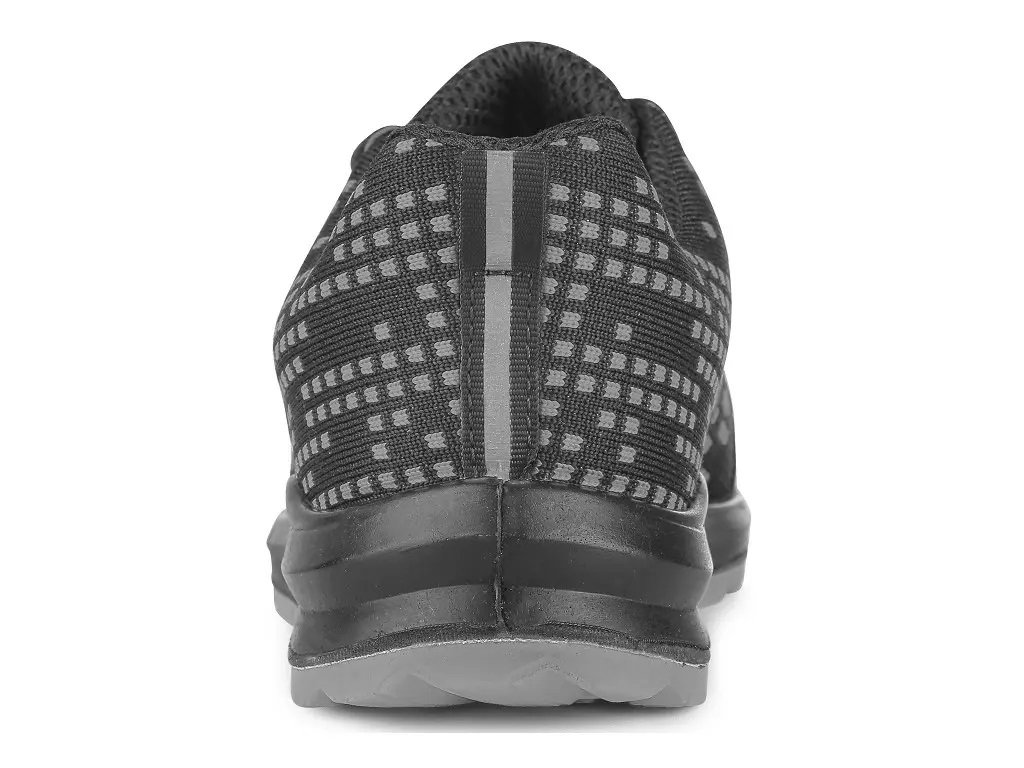 Textilná poltopánka s oceľovou špicou a reflexnými doplnkami. Materiál: zvršok z odolného 1,8 - 2,0 mm polyesteru prateľného do 30 ° C, predná časť zosilnená mikrovláknom, 3-vrstvová priedušná textilná podšívka, PU-PU, protišmyková, olejovzdorná, antistatická podošva.