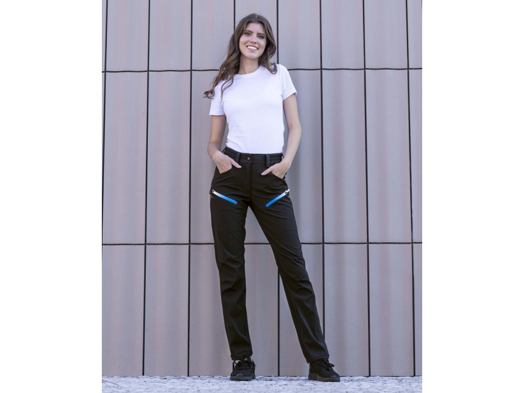 Dámske softshellové nohavice majú priliehavý strih SLIM FIT. Štvorsmerne elastický ľahký softshell ElasticTech®Flexi s membránou je vhodný aj na náročné aktivity, poskytuje vynikajúcu ochranu proti vetru, je nepremokavý, rýchlo schne a udržiava optimálnu telesnú teplotu. Vetracie zipsy so sieťovinou na vonkajšej strane stehien. Chrbát je rozdelený sedlom, 2 vrecká na zips na prednej strane, elastický, tvarovaný pás zvyšuje pohodlie pri nosení. Funkčné tvarovanie nohavíc, zúžený strih, lem nohavíc s možnosťou úpravy obvodu pomocou gombíkov, vnútorný háčik s gumičkou na zapínanie nohavíc na topánky. Dizajn je ozvláštnený 3D reflexnými potisky