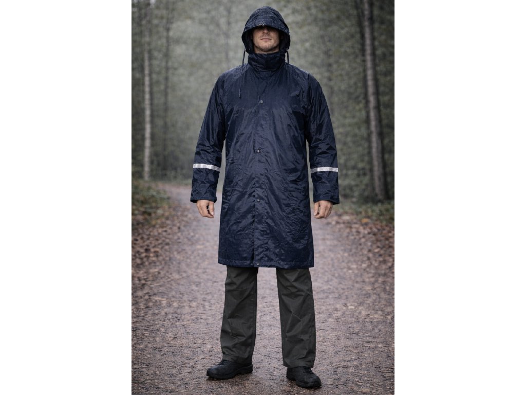 Nepremokavý plášť do dažďa s kapucňou v golieri a reflexnými doplnkami, s nižšou hmotnosťou.