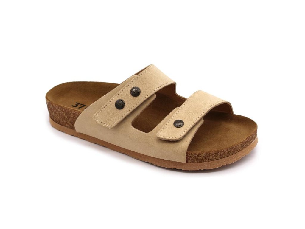 - Zvršok a ozdobné pásiky sa vyrábajú z prírodnej hladkej a velúrovej kože. Prírodný materiál zabezpečuje priedušnosť. Vďaka dostatočnému priestoru pre prsty je vhodná aj pre osoby s haluxami / vybočeným palcom/. Zvršok je bez možnosti nastavenia.