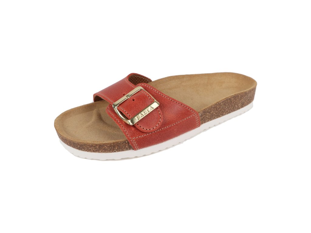 Nadčasovosť, štýlovosť, bezkonkurenčná kvalita a nezabudnuteľný komfort. Týmito vlastnosťami vyniká jednopracková obuv značky BAREA. Šľapky sú vhodné do interiéru (ako školská, kancelárska, domáca i prezuvková obuv) alebo do suchého exteriéru (ako vychádzková obuv). Celokožený oranžový zvršok (pravá hovädzia koža) s jednou nastaviteľnou zlatou prackou sa dokonale prispôsobuje líniám chodidla.