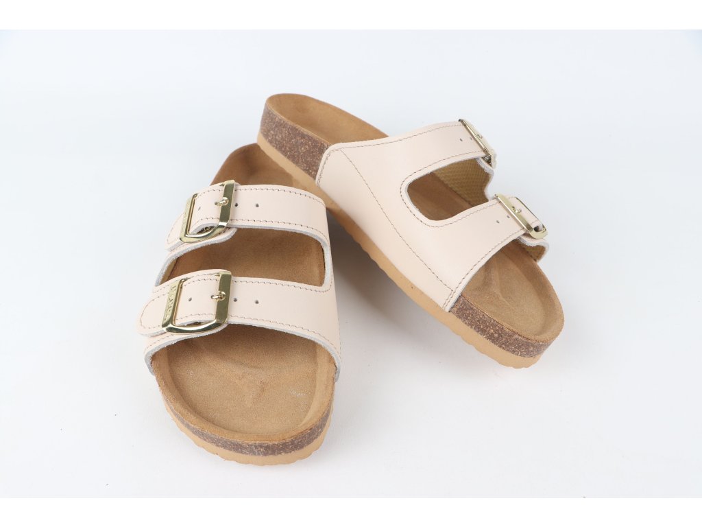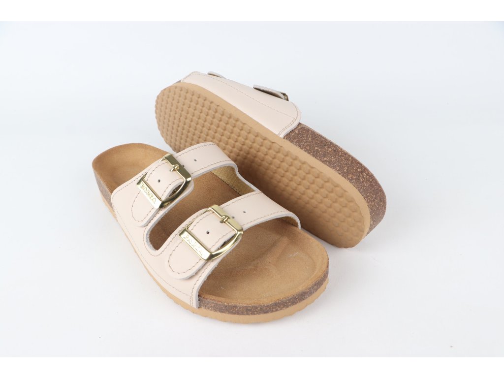 Stielka je korková (prírodný korok), anatomicky tvarovaná, potiahnutá béžovou kožou (pravá hovädzia koža), podporuje správne držanie chrbtice a komfortnú chôdzu. Podošva je rovná, vyrábaná z tvrdeného styroporu čiernej farby. Model vyrábame ručným spôsobom, lepením a zalisovaním korkovej stielky na styroporovú podošvu.